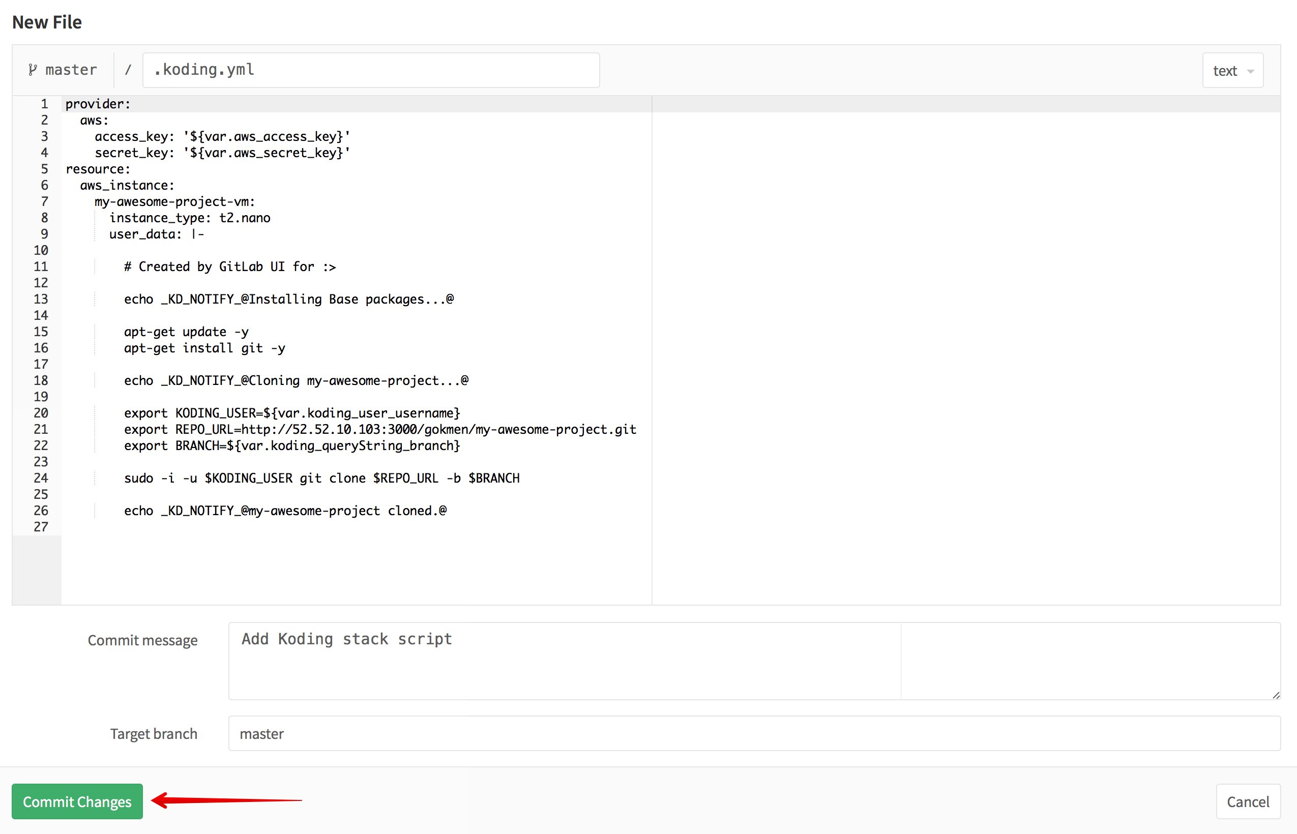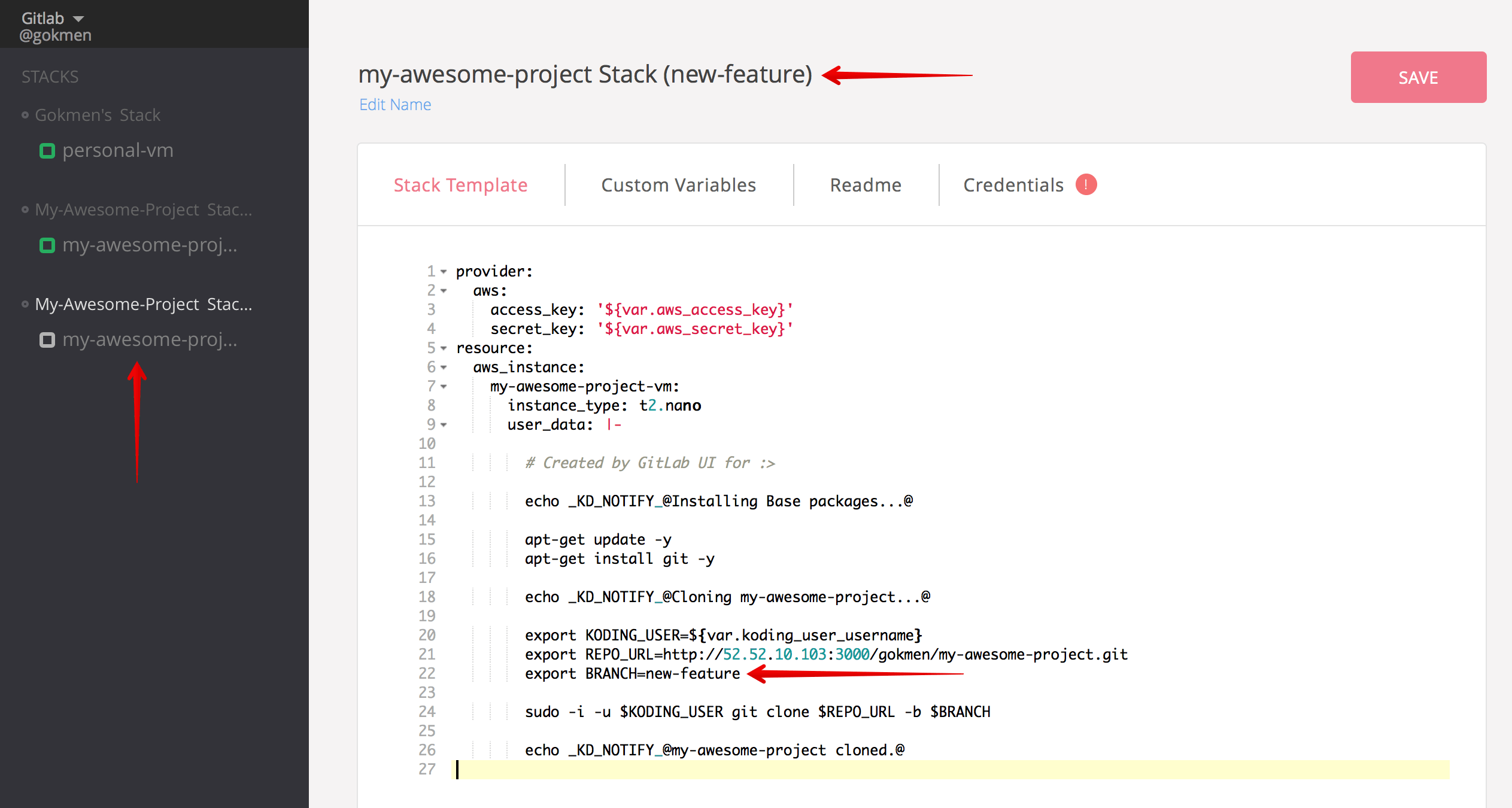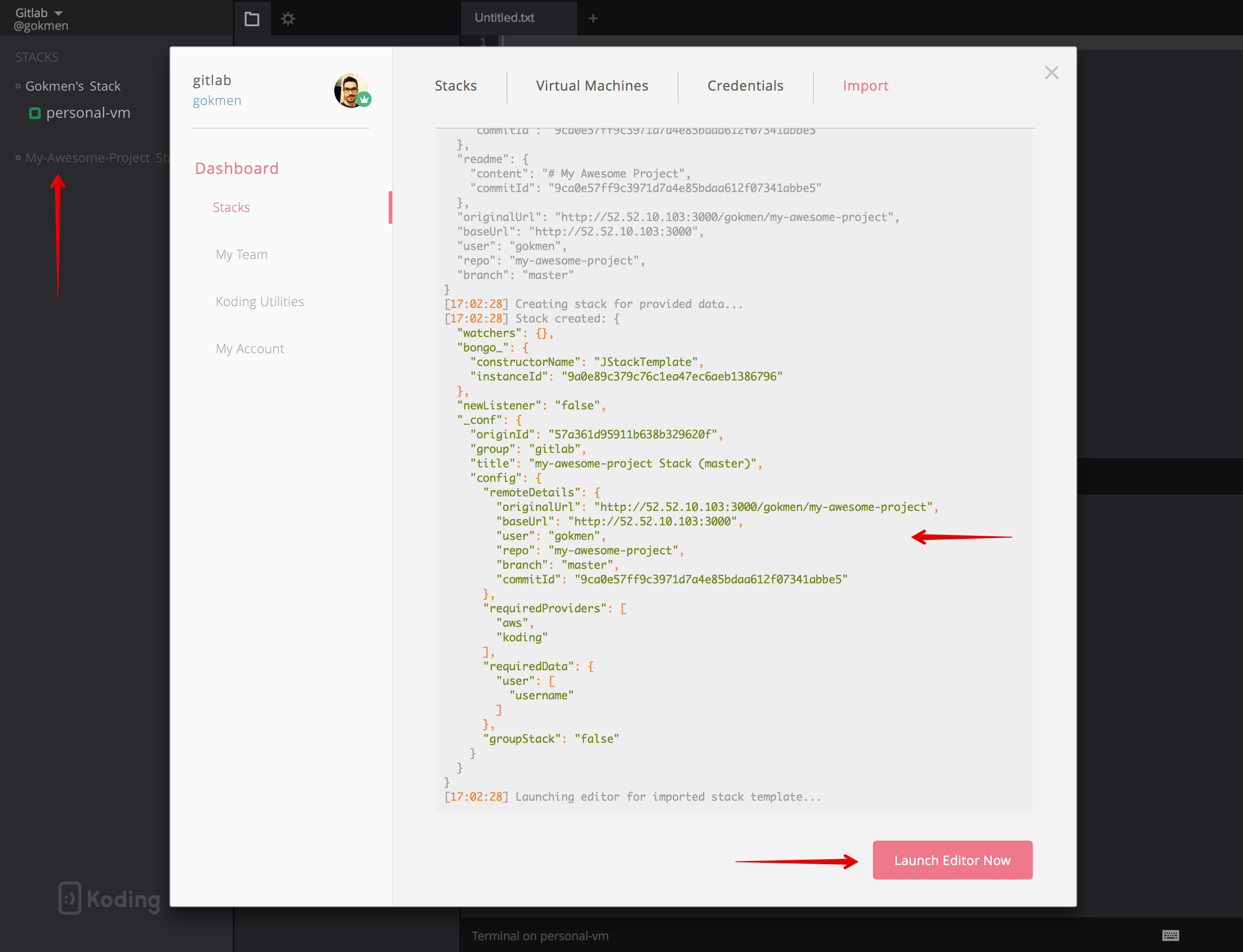 This will again take you to Koding with proper arguments passed, which will allow Koding to modify the stack template provided by target branch. You can see the difference;